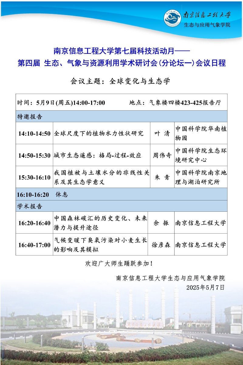 南京信息工程大学 第七届科技活动月 —— 第四届 生态、气象与资源利用学术研讨会 (分论坛一 )会议日程