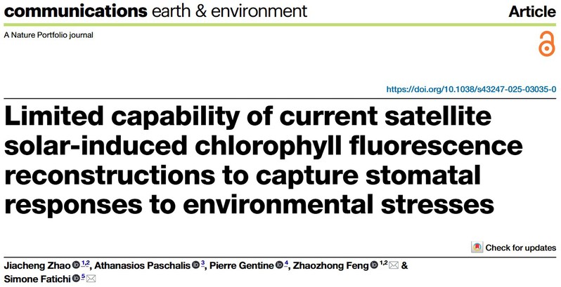 论文信息:Jiacheng Zhao, Athanasios Paschalis, Pierre Gentine, Zhaozhong Feng* & Simone Fatichi*. Limited capability of current satellite solar-induced chlorophyll fluorescence reconstructions to capture stomatal responses to environmental stresses. Communications Earth & Environment, 2026, 7: 9. https://doi.org/10.1038/s43247-025-03035-0.