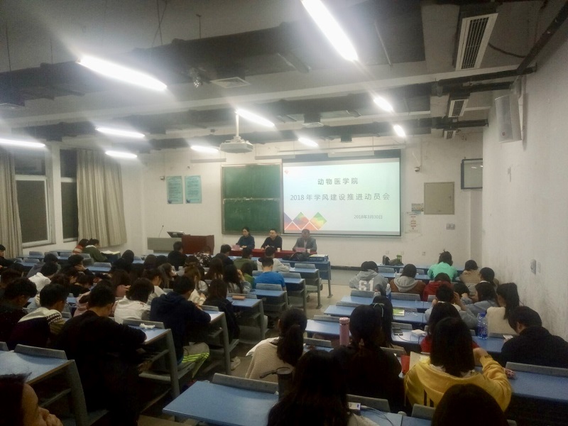 3月30日晚19:00,动物医学院在合301教室成功召开2018年学风建设推进动员会。学院党总支副书记张瑞春、副院长宋予震、辅导员聂丹和2016级本科专业学生共同参加了此次会议。会议由聂丹老师主持。