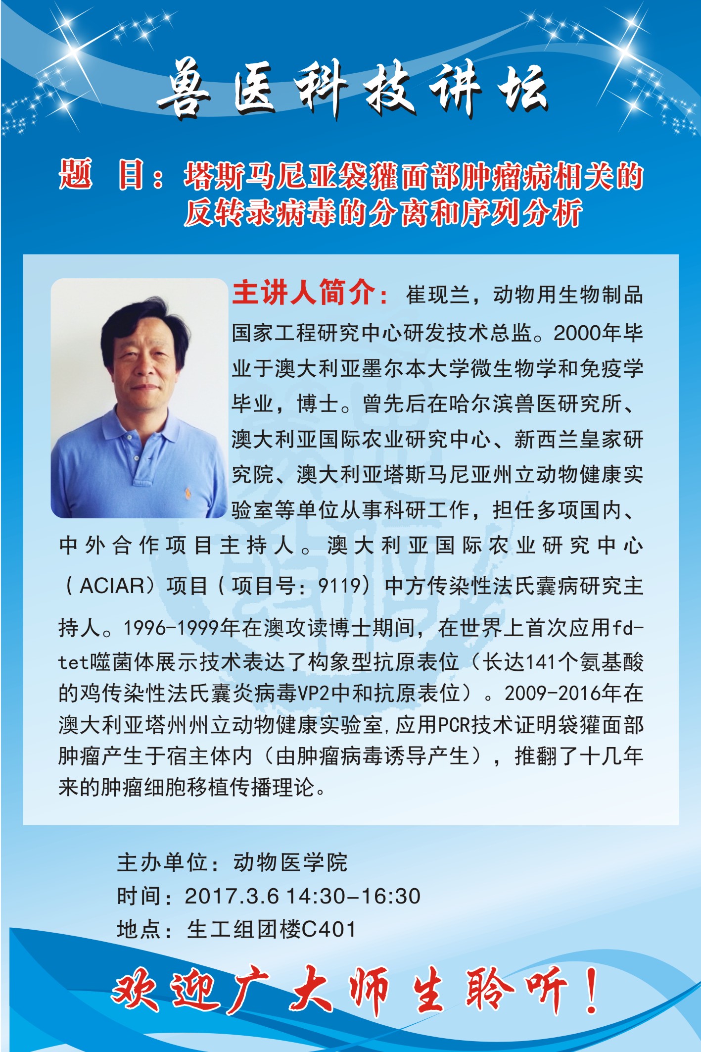 上一条:兽医科技讲坛开讲啦——开坛首讲:塔斯马尼亚袋獾面部肿瘤病相关的反转录病毒的分离和序列分析
