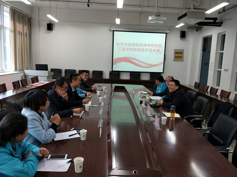 2017年11月4日,信阳农林学院牧医工程学院预防兽医教学团队刘涛、董建国、连慧香、李洵、阮崇美五位教师来我院交流考察课程建设、教学质量监控、实践教学等内容。动物医学院副院长宋予震、教学秘书吴玉臣、兽医传染病与寄生虫病学教研室主任徐耀辉、兽医微生物与免疫学教研室主任曹素芳参加了本次交流活动。