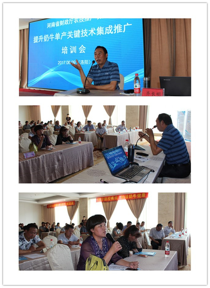 2017年6月9日上午,由我院“草食动物疾病研究”科技创新团队承担的河南省财政厅农技推广项目——“提升奶牛单产关键技术集成推广”培训会在洛阳顺利召开。参加本次会议的有河南牧业经济学院副校长张卫宪、科研处处长邱国鑫、科研处副处长胡华锋、国内著名奶牛疾病专家中国农业大学齐长明教授、河南省奶牛生产性能测定中心主任张震博士、洛阳市畜牧局局长李治力、洛阳市畜牧站站长王明旻、洛阳市及济源市规模化奶牛场的专业技术及管理人员、项目组成员及河南日报社、洛阳市电视台记者等近140人。会议由邱国鑫处长主持。