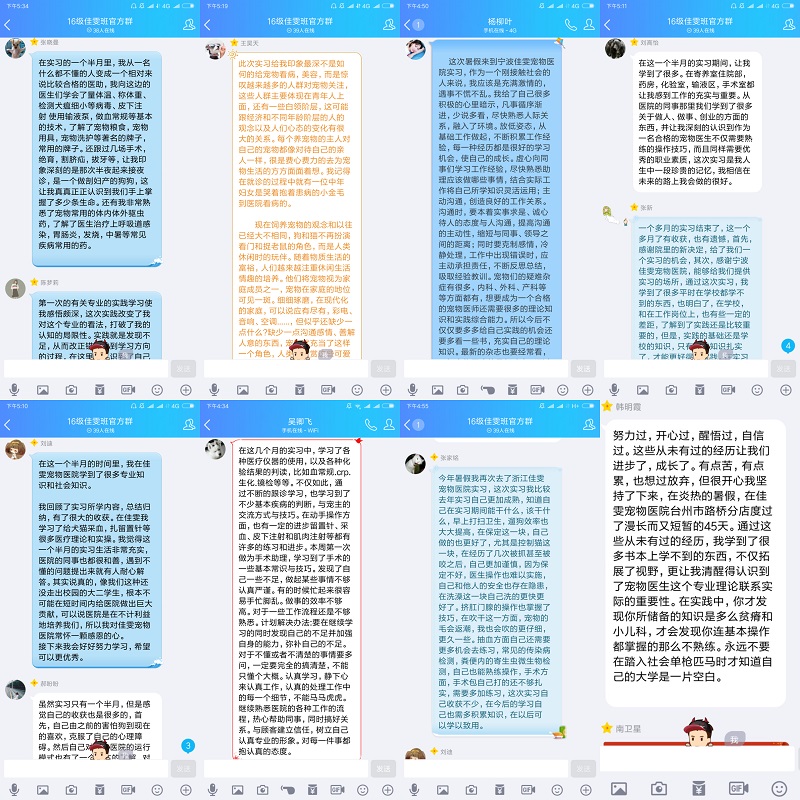 8月27日,浙江佳雯宠物医院在总院召开了优秀实习生表彰大会,学院“佳雯班”的陈梦莉等11名同学用他们的努力、勤奋、汗水在2018年佳雯宠物医院暑期实习工作中,被评为“优秀实习生”。暑期认知实习虽已经划上句号,同学们纷纷表示学习到的专业知识、技能与留在心中的回忆与感受却是难忘的。同学们通过班级QQ群分享了实习期间的体会与感受,深刻认识到学好专业知识的重要性。韩明霞同学说到,此次认知实习不仅拓宽了自己的专业视野,更重要的是让她清醒的认识到专业理论知识联系实际在宠物诊疗行业的重要性。