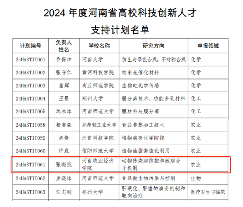 近日,河南省教育厅公布了2024年度河南省高校科技创新团队支持计划和河南省高校科技创新人才支持计划入选名单(教科技〔2023〕325号),全省共确定73名河南省高校科技创新人才,省教育厅对每位入选者支持科研经费30万元(数学、管理科学与工程领域为20万元)。我院兽医学科骨干成员张晓战副教授获2024年度高校科技创新人才支持计划,是我院在创新类人才项目上的又一大突破,体现了我院教师较高的科研水平和创新能力。