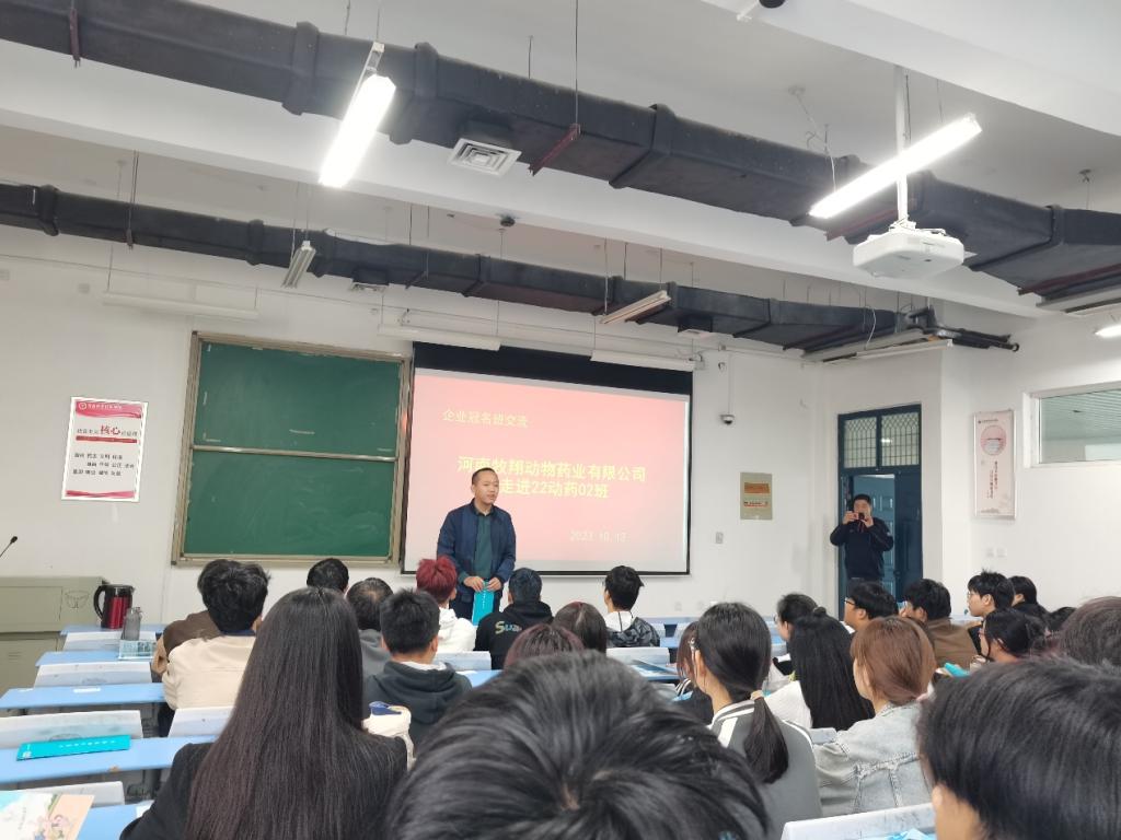 为深化校企合作,共育应用型人才,10月13日下午,在二号教学楼合班教室403,河南牧翔动物药业有限公司人事总监蒋吉勇总经理、企业班主任张印以及猪药首席畜牧师代广军与22动药2班全体同学们进行了交流。参加此次交流会的还有动物医药学院党委副书记汪洋、辅导员康宇、校方班主任王炼。