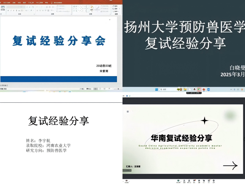 为精准助力考研学子科学备战复试,全面提升个人综合竞争力,动物医药学院于3月10日至13日创新打造“云端传帮带”育人平台,特邀来自华南农业大学、扬州大学、西北农林科技大学、河南农业大学及哈尔滨兽医研究所的10位名校硕士校友组成“复试智囊团”,为2025届考研学子提供宝贵的复试经验和技巧。