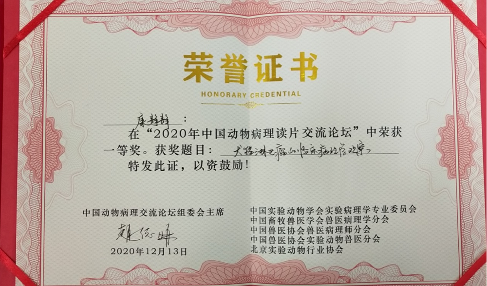 为促进青年病理工作者的发展和进步,本次论坛开设了青年报告模块,为青年兽医病理学工作者提供了宝贵的交流学习机会,康静静博士在论坛中以《犬猫淋巴瘤的临床病理学观察》为题作了汇报,并获得一等奖。