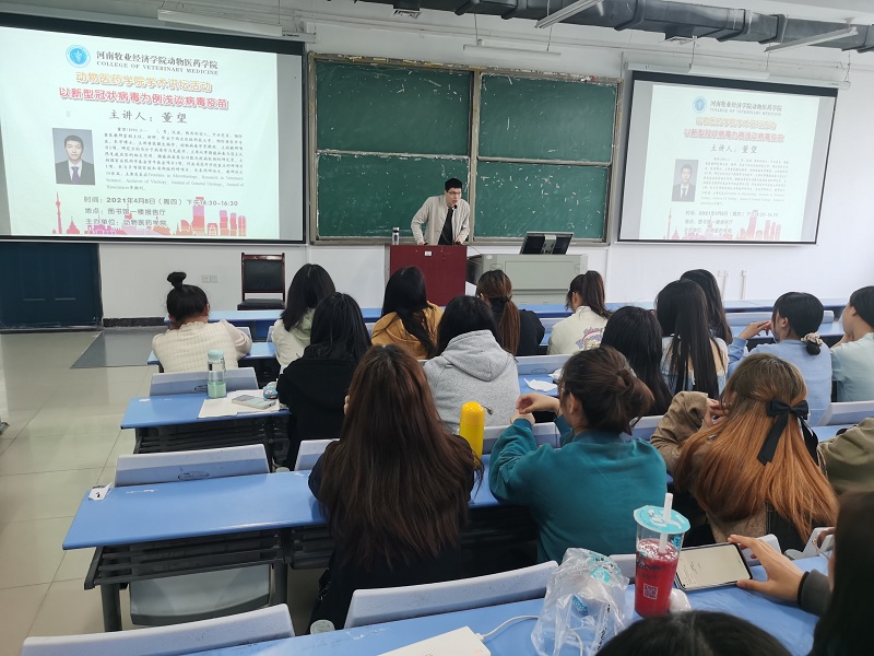 2021年4月8日下午2点半,我院在一号教学楼合300教室举办了“以新型冠状病毒为例浅谈病毒疫苗”的学术讲座活动。本次活动特别邀请到了预防兽医教研室副主任董望老师。本次活动由院科研办公室主任李向辉老师主持,我院2018、2019、2020级动物医学专业本科生参加了本次活动。