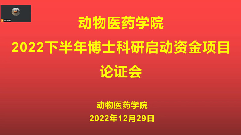2022年12月29日下午,动物医药学院以线上腾讯会议的方式举行了博士科研启动资金项目评审会,此次会议邀请了我院特聘教授王俊东,校发展规划处副处长皇甫和平,院长宋予震,科研副院长李利红,兽医学科方向负责人乔宏兴、马霞担任评委。吴玉臣、卢婷婷、李向辉等8位博士作为汇报人参加了此次项目评审会。
