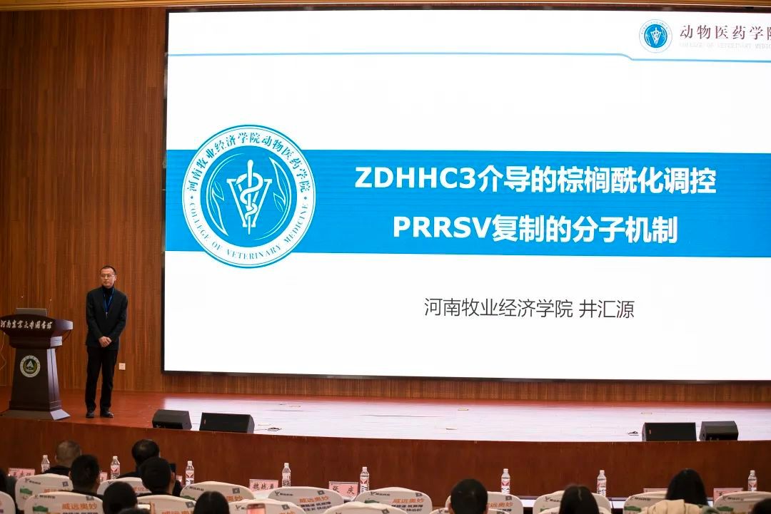 在会议的主旨报告环节,我校动物医药学院副教授井汇源应邀作题为《ZDHHC3介导的棕榈酰化调控PRRSV复制的分子机制》的学术报告,分享了其在猪繁殖与呼吸综合征病毒(PRRSV)复制调控机制方面的最新研究成果。该研究不仅揭示了病毒复制调控过程中的关键分子机制,也为PRRSV防控策略的开发提供了新的理论依据和潜在药物靶点。