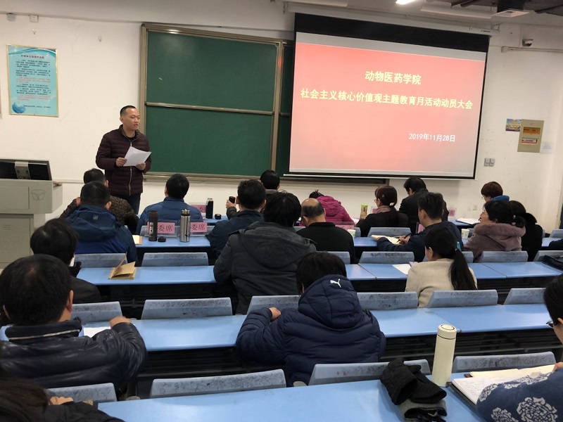 11月28日下午4:30,动物医药学院于合504教室召开2019年社会主义核心价值观主题教育活动月动员大会。学院党委书记刘永录,院长宋予震与全体教师共同参加。