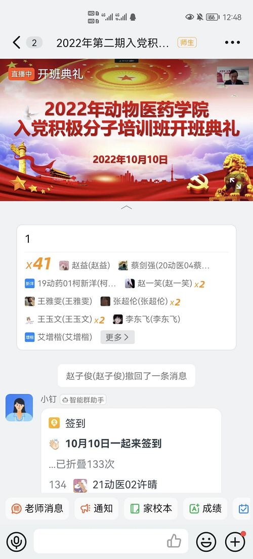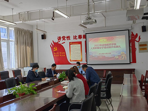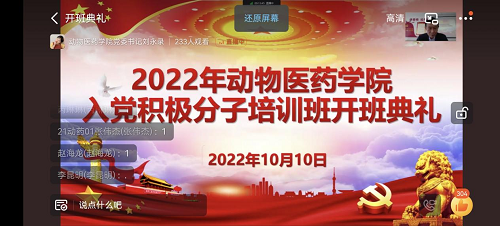 2022年10月10日中午,动物医药学院2022年第二期入党积极分子培训班开班典礼于生工楼C401会议室举行。动物医药学院党委书记刘永录,党委副书记汪洋,团委副书记陈雁雪和闫一博,以及全体辅导员到场,本期238名入党积极分子学员通过钉钉直播进行线上观看。