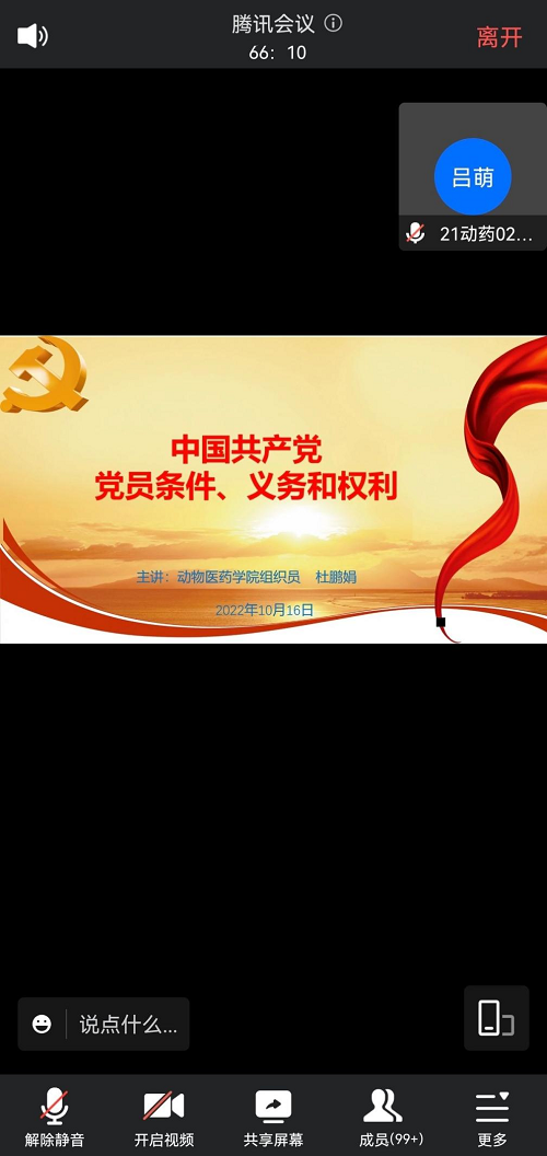 为提高入党积极分子对党员队伍的认识,加强入党积极分子对党员基本条件的理解,认真履行并正确实施党员义务和党员权利,10月16日晚,入党积极分子培训课程第八讲《党员条件、义务和权利》开讲,此次专题讲座由动物医药学院正处级组织员杜鹏娟老师讲授,本期238名入党积极分子学员通过腾讯会议进行线上学习。