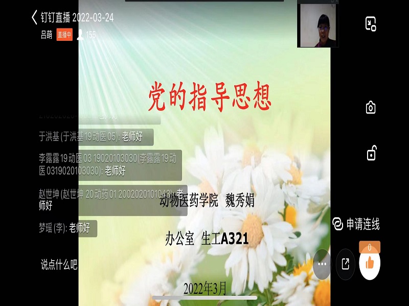 为提高入党积极分子们的党性修养,加强入党积极分子对党的认识,积极开展我院党政工作、落实党内政策。3月24日晚,入党积极分子培训课程第二讲《党的指导思想》开讲,此次专题讲座由动物医药学院正处级组织员魏秀娟老师讲授,本期172名入党积极分子学员通过钉钉直播进行线上学习。