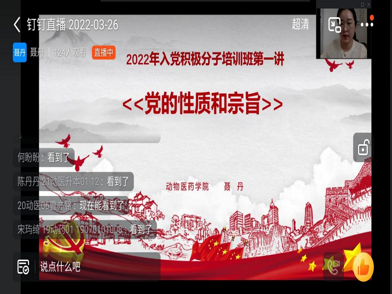 为适应新形势下党员的需要,加强入党积极分子对党的认识,强化对全体学员的思想教育。3月26日下午,入党积极分子培训课程《党的性质和宗旨》开讲,动物医药学院团委副书记聂丹担任本期党课第四讲的主讲老师,学院本期172名入党积极分子通过钉钉直播进行线上学习。