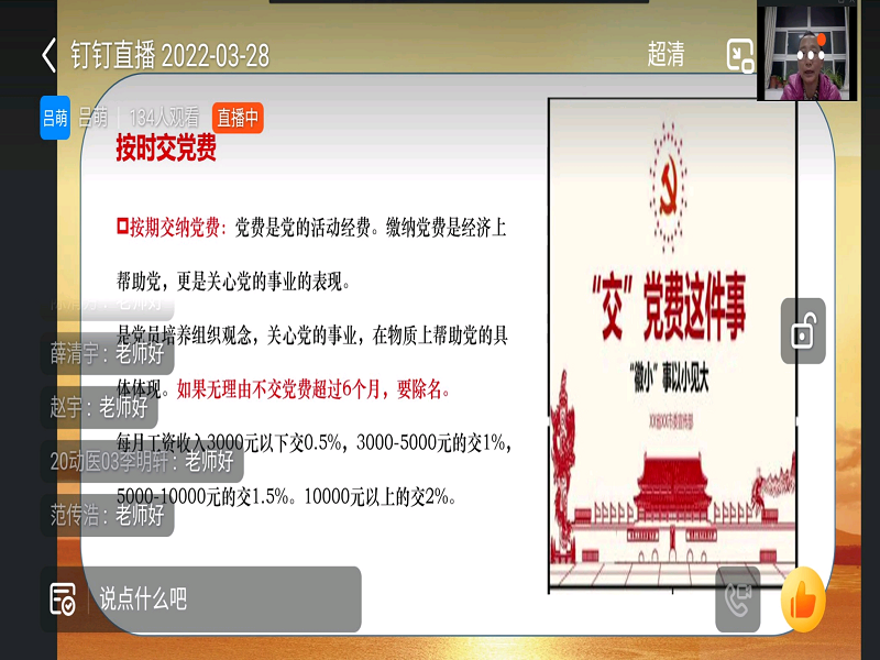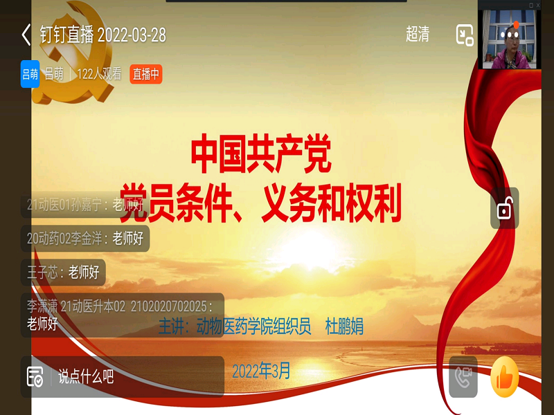 为提高入党积极分子对党员队伍的认识,加强入党积极分子对党员基本条件的理解,认真履行并正确实施党员义务和党员权利。3月28日下午,入党积极分子培训课程第五讲《中国共产党党员条件、义务和权利》开讲,此次专题讲座由动物医药学院正处级组织员杜鹏娟老师讲授,全体入党积极分子学员通过钉钉直播进行线上学习。