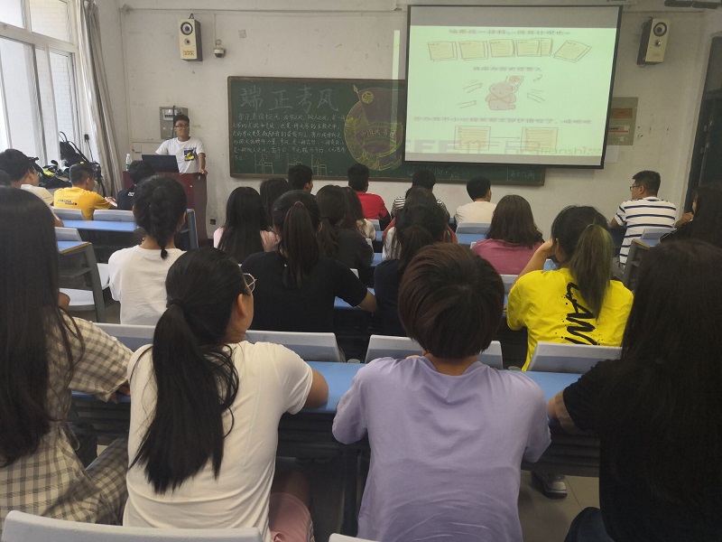6月13日,我院组织18级学生于二号楼各班固定教室开展以“端正考风,诚信考试”为主题的团课活动。