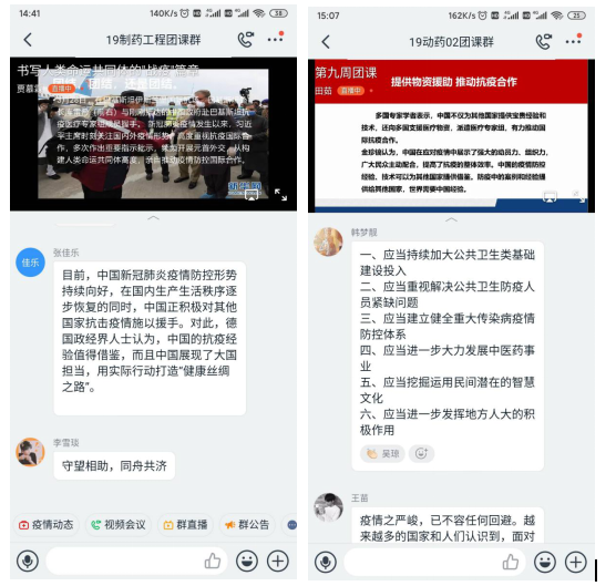 首先,由各班团课主持人组织本班同学学习新华网发布的《书写共建人类命运共同体的战“疫”篇章》,同学们深切地了解到习近平总书记作为大国领导人的远见和担当,认识到了只要我们经受住疫情的考验,中国与世界的友谊就能不断升华,中国与世界的合作就会更加坚固。紧接着,针对习近平总书记提出的“四个自信”、“构建人类命运共同体”的内涵进行学习,让同学们对于我国提出的“守望相助,同舟共济”的相处之道进行思考,同学们积极讨论,支持并坚定中国参与全球战“疫”的立场:以身作则,以行践言;恪守国际道义,践行大国担当。最后,全体同学线上观看由新华社发出的战“疫”篇章的视频,同学们在消息栏处发表自己的看法,表达自己作为中国人的自豪感!