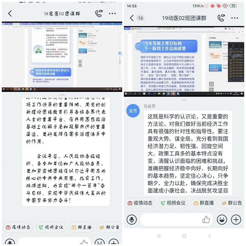 2020年5月28日,下午2:30至4:00,我院组织19级各班在钉钉团课群中开展以“青年看两会,青春话使命”为主题的团课学习活动。