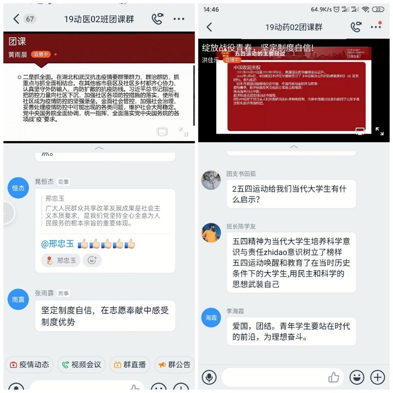 4月23日下午2:30至4:00,我院组织19级全体同学在钉钉团课群里开展以“绽放战疫青春,坚定制度自信”为主题的团课学习活动,旨在通过让同学们了解在中国特色社会主义道路下国家如何迅速做出反应控制疫情,抗疫英雄如何不断涌出为疫情绽放出自己最美的青春!
