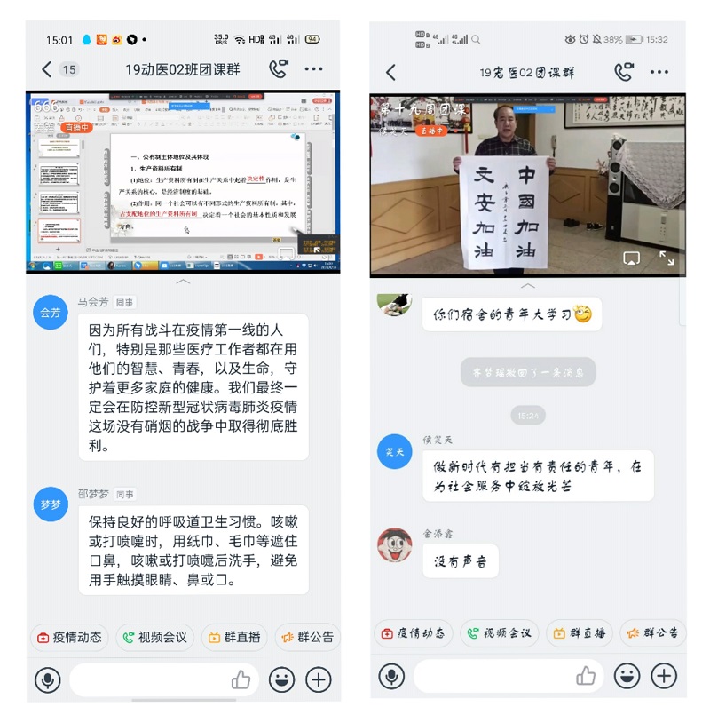本周团课各团支部均以直播的形式开展。首先,由各班主持人介绍当前的疫情形势,在党中央的坚强领导和全国人民的众志成城、共同抗疫的坚定决心下,我国疫情防控形势趋于稳定,但风险依然存在,防控警惕性不可降低,必须持续抓好疫情常态化防控工作,绝不能掉以轻心。接着,同学们共同学习了关于《习近平与大学生朋友们》系列专题报道,各班主持人引导同学们对部分报道进行研读,交流感想。大家纷纷表示,要认真向习近平总书记学习,不断从总书记与大学生朋友们的生动故事中汲取政治营养,激发奋斗精神,凝聚前进力量。最后,针对本周青年大学习主题进行拓展学习,了解到党中央坚持以公有制为主体,把社会主义制度和市场经济制度有机结合起来的优势,增强了团员青年的制度自信和道路自信。