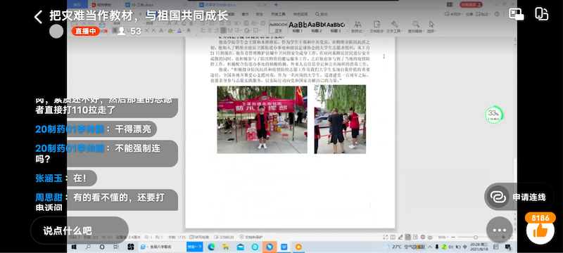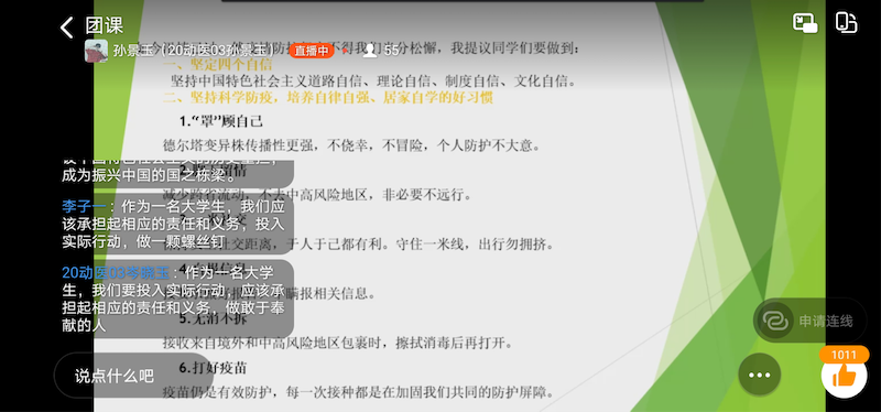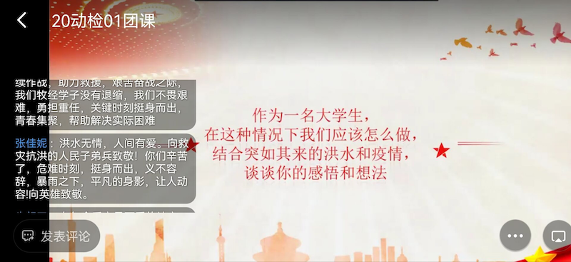 本次团课顺利进行,同学们积极参与,并且表示通过本次团课进一步激励和引导广大学生“把灾难当教材,与祖国共成长”的意识,进一步坚定“四个自信”,坚持科学防疫,培养自律自强、居家自学的良好习惯,积极参与当地志愿服务,用实际行动筑起疫情防控的“青春长城”。(文/图关兵峰)