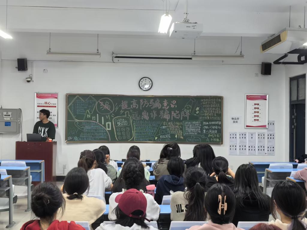 在团课开始前,各班合理分配工作,小组成员积极收集相关材料,绘制与主题相关的黑板报,为团课的成功开展做了充分准备。团课伊始,主持人先向同学们介绍了近几年来常见的新型诈骗案例,并以此为切入点深入浅出地剖析了当代年轻人尤其是学生群体经常被骗的原因。接着,主持人为同学们放了一段反诈宣传视频,里面讲道:“其实识破套路并不难,最难的莫过于控制住自己那颗被引诱的蠢蠢欲动的心,诈骗分子抓住的不仅是我们的知识漏洞,更是我们的心存侥幸的思想。”同学们只有认清“天上不会掉馅饼”的道理,才能擦亮眼睛,拒绝掉入诈骗陷阱。最后,主持人结合本次团课主题为同学们介绍了一些诈骗的辨别方法以及预防措施,比如不要在网络上泄露自己的信息、不要点击不明链接、不要转移资产到所谓的安全账户等,同学们表示受益良多。