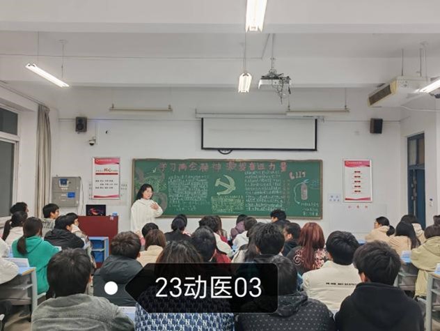为深入学习贯彻“两会”精神,全方位、多角度关注“两会”动态,提高青年学子思想觉悟,强化新时代青年的使命与担当,2024年3月14日,动物医药学院组织23级全体同学开展以“聚焦全国两会,奋楫崭新时代”为主题的团课学习。