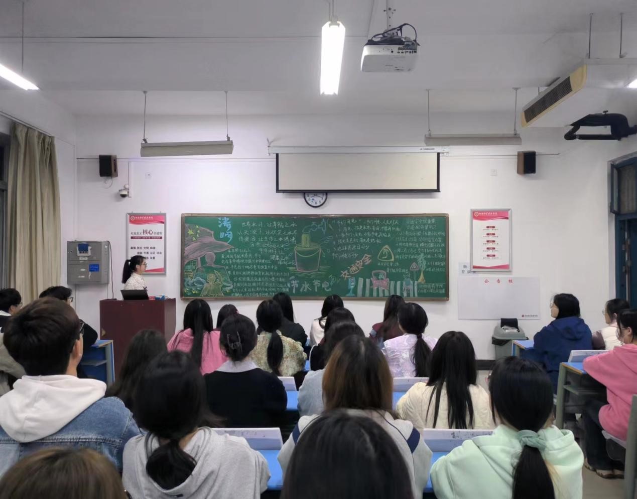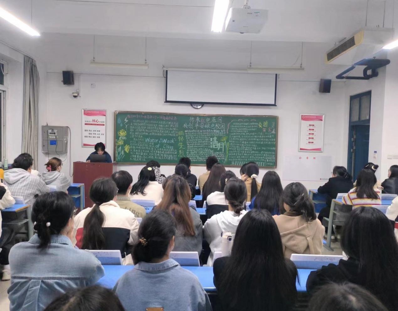 本次团课分为三个部分,第一个部分为“清明祭英烈 深情慰忠魂”。主讲人通过播放幻灯片和视频,展示了先烈们的英雄事迹,引导同学们对革命精神的时代价值展开思考。同学们表示:英雄撼天地,光芒照后人。我们要借清明节来缅怀英烈先辈的丰功伟绩,传承接力红色基因,做有理想、敢担当的新时代青年。第二个部分为“文明交通,你我同行”。主持人结合“文明交通倡议书”和相关交通案例,强调了提升交通安全守法意识的重要性,同时指出校园中电车不规范行为,规劝同学们文明骑车、规范出行。第三个部分为“节水节电,绿色生活”。主持人从本次的“中国水周”展开深入讲解,使同学们了解了当今资源紧缺的现状,引导同学们要从点滴小事做起,逐步养成节约的行为习惯,并与同学们就如何做到“三节”进行讨论,呼吁大家绿色节能生活从点滴做起。