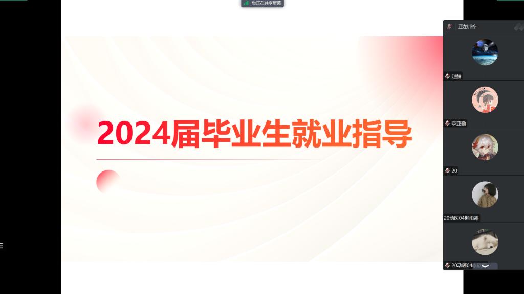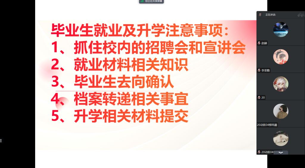 为了更好地服务2024届毕业生,帮助他们更好地了解就业形势、明确个人职业定位、树立正确的择业观与就业观,动物医药学院于10月15日线上召开了一场毕业生就业创业指导会,分别就就业政策、求职技巧和创业指导等方面为毕业生进行了详细解读和分析,本次会议由学院就业专干赵赫主持,24届毕业生各班学生代表参会。